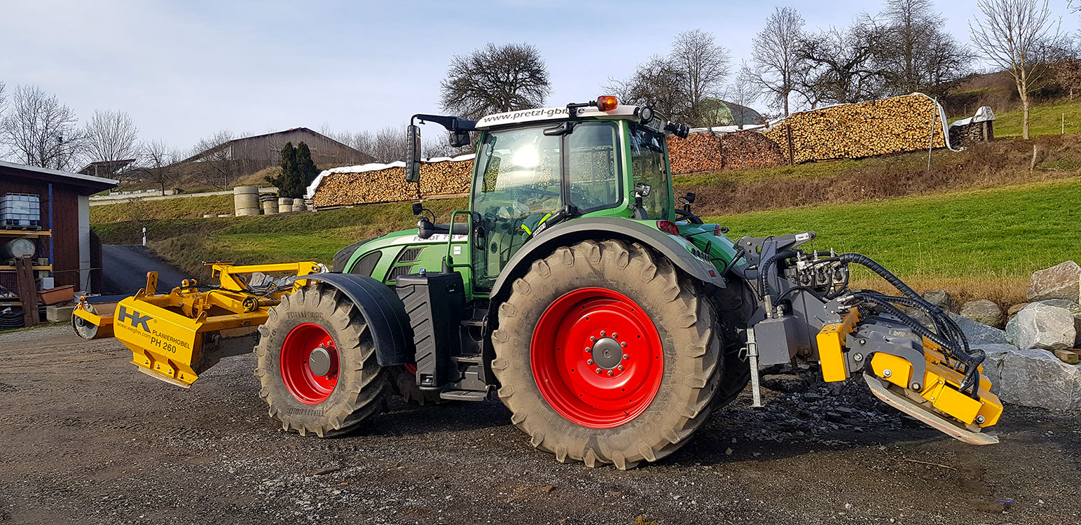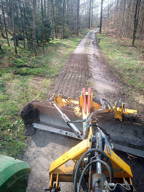 Für die Oberflächenbearbeitung haben wir einen großen Traktor mit einer Anbau-Gesteinsfräse, mit dem wir das Wege- baumaterial an der Oberfläche auffräsen und zerkleinern. Danach wird die Oberfläche mit dem Grader profiliert und mit einem Plattenverdichter verdichtet.